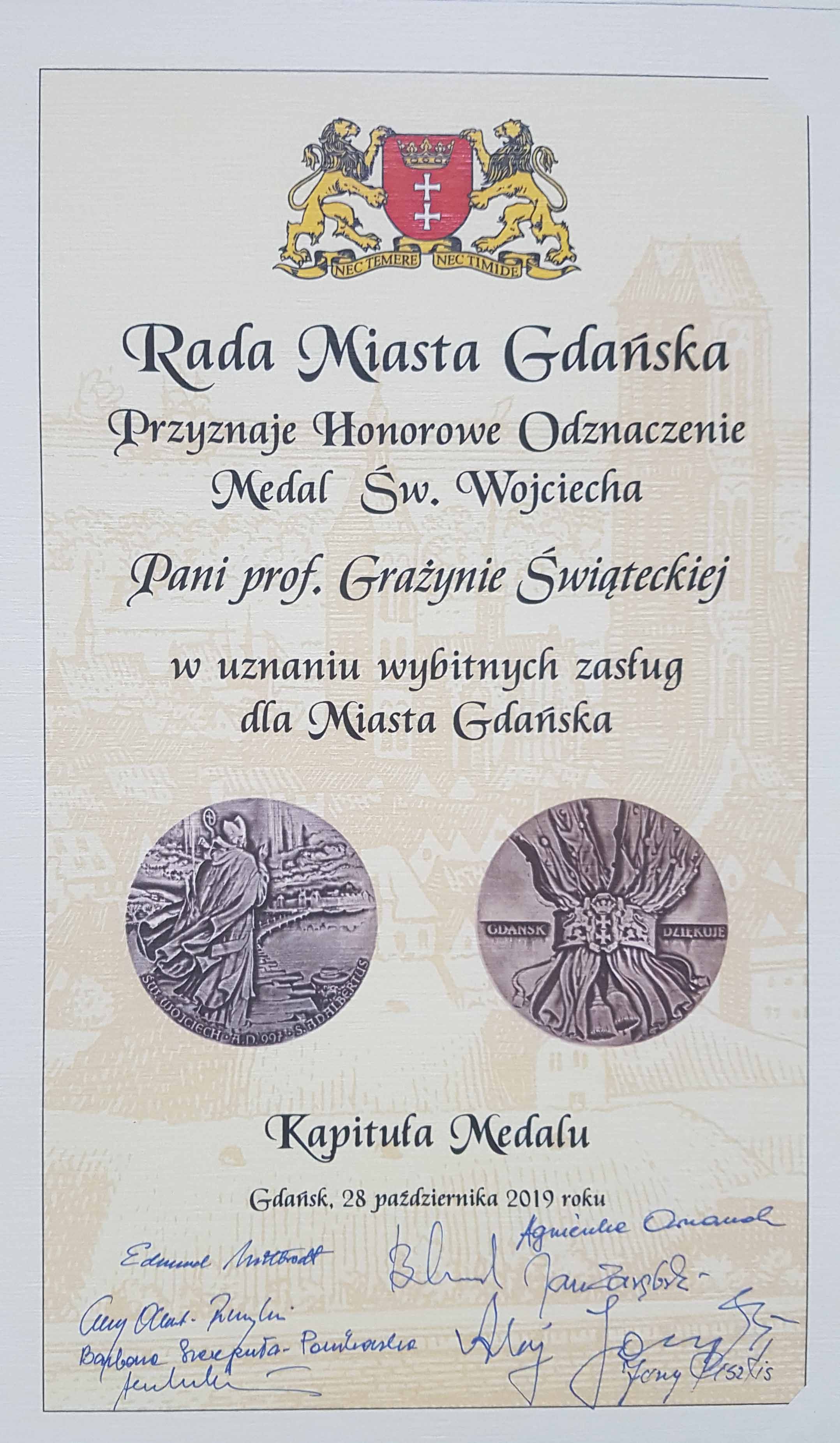 28 października br. prof. Świątecka została uhonorowana Medalem św. Wojciecha przez Radę Miasta Gdańska.